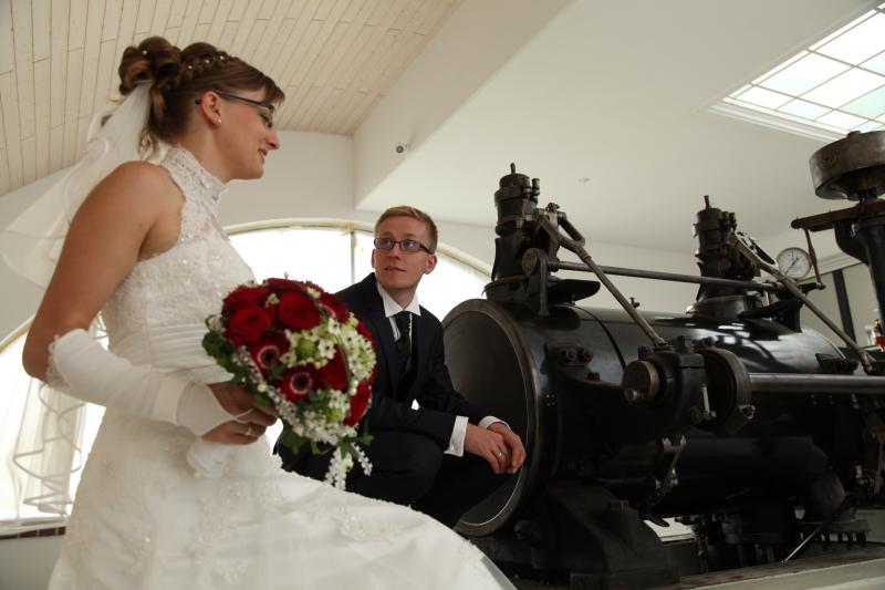 Die Dampfmaschine erstrahlt durch aufwändige Restaurierung durch die „Bulldogfreunde Erzgebirge e. V“. wieder im alten Glanz. Sie ist neben Original Wand- und Bodenplatten, Stahl-Industriefenster und der Oberlichtverglasung, die in mühevoller Handarbeit vom Altstandort der Dampfmaschine in Hammerunterwiesenthal ausgebaut wurden, Mittelpunkt des Trausaales.